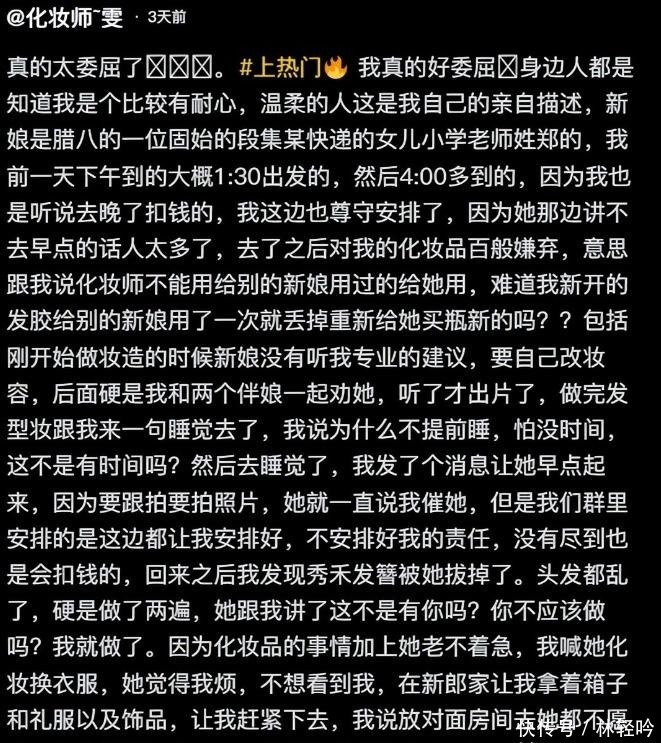 导火索源自新娘本人。婚宴落幕次日,郑女士便在某主流社交平台发布长文,标题赫然写着“紧急避雷!婚礼化妆师黑名单”,矛头直指为其执妆的小雯老师。