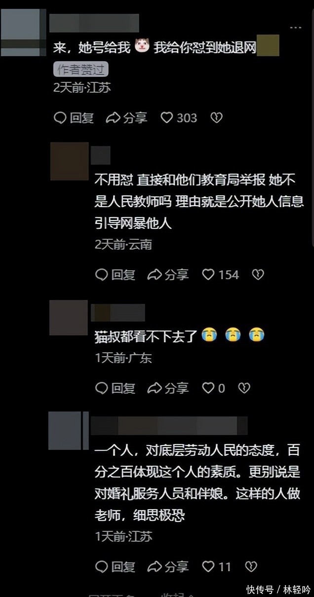教育的根本使命在于立德树人,“学高为师,身正为范”是刻入职业基因的准则。可她的所作所为,却与“师者”二字背道而驰,自私、傲慢、缺乏共情力暴露无遗。网友随即发起理性抵制,舆论焦点也自然延伸至新郎家庭层面。