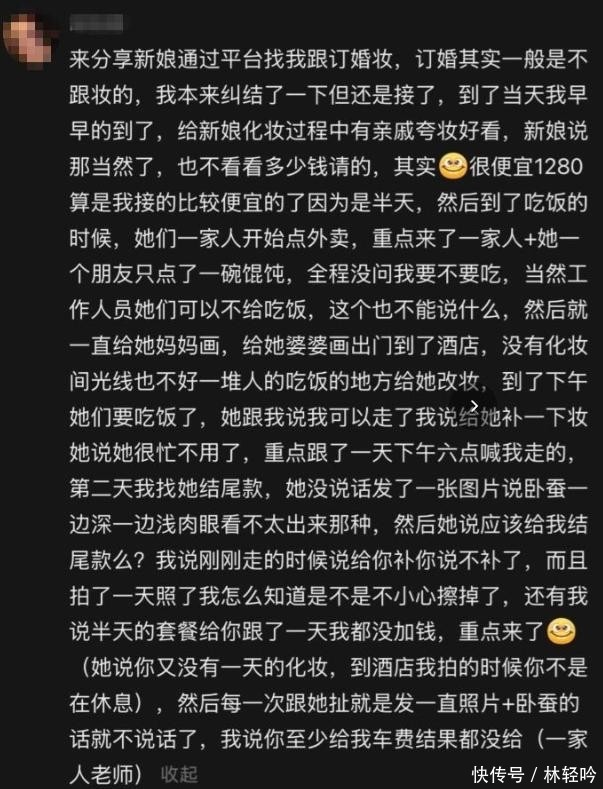 婚礼前夜,她突然通知小雯提前五小时到场待命,结果对方冒雨抵达后,她却自行回房酣睡,全程未予理会,任由化妆师在客厅枯坐等待。