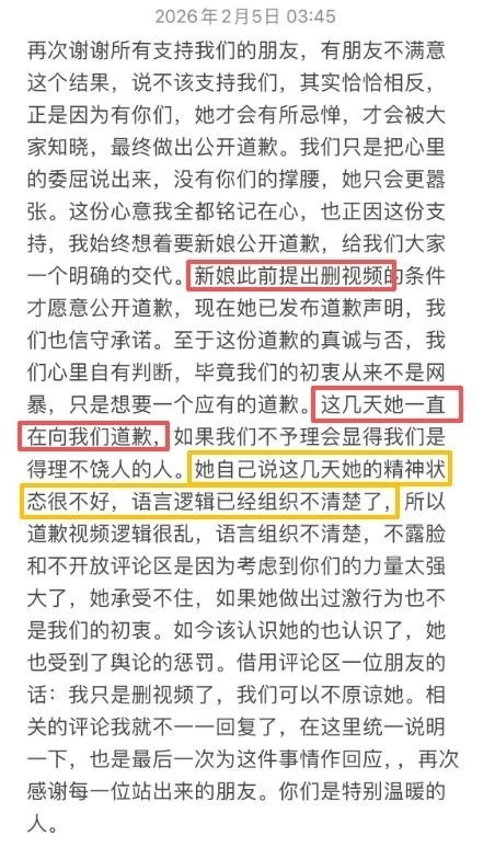 经多轮沟通,双方达成一致:控诉方删除原始曝光视频,郑女士则以纯文字形式发布致歉声明,并解释自己未露脸的原因是“近期严重失眠、语言表达混乱,且担忧遭受大规模网暴攻击”。