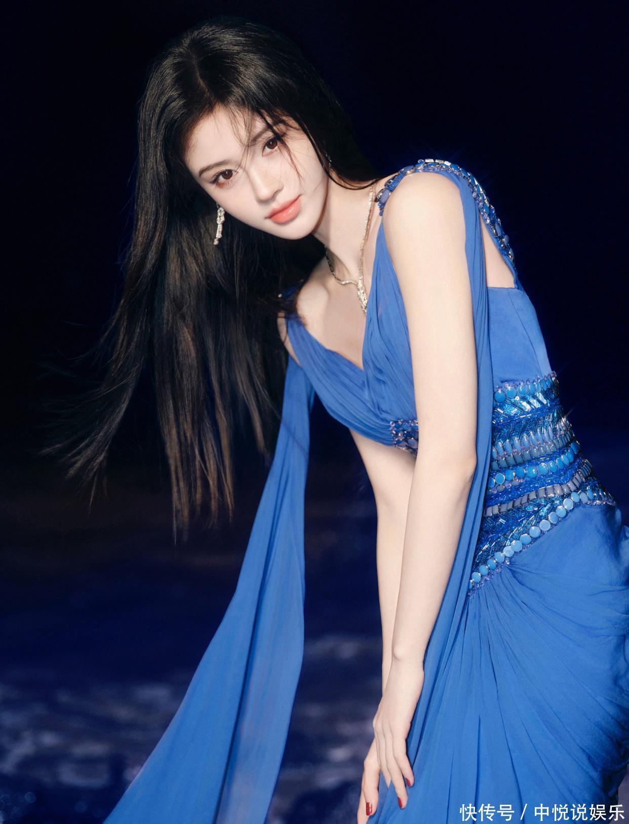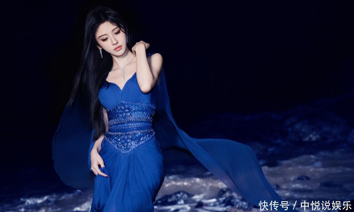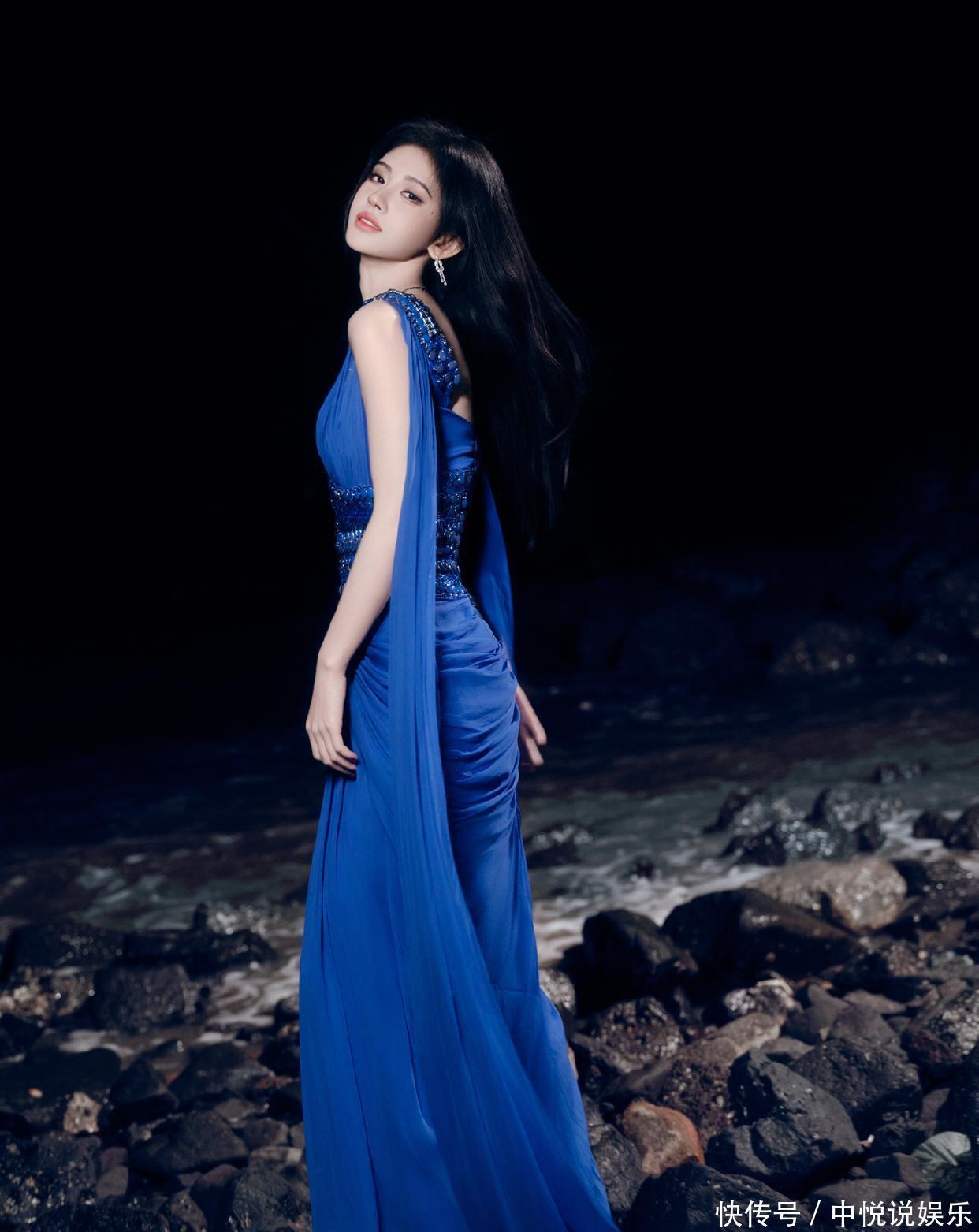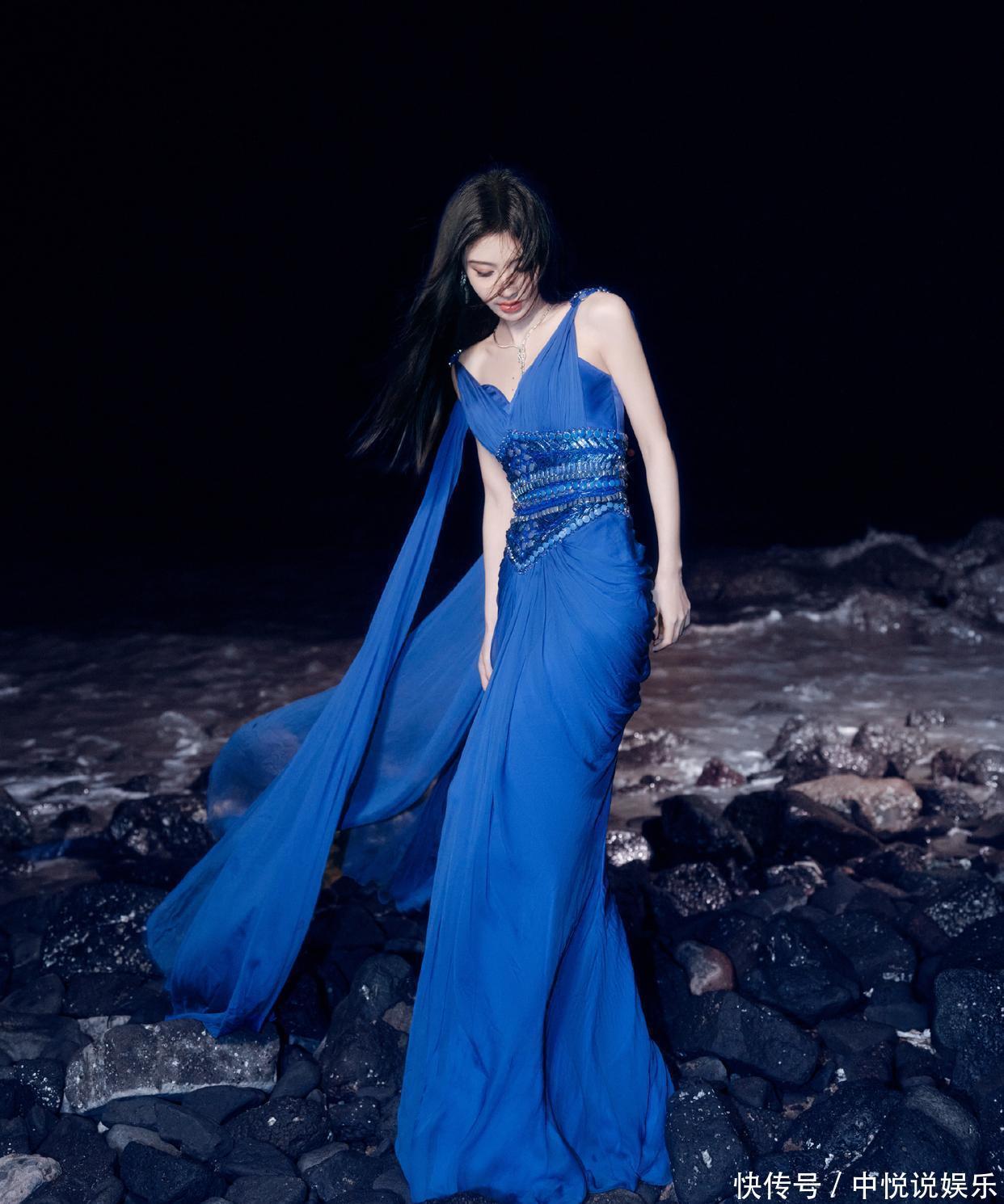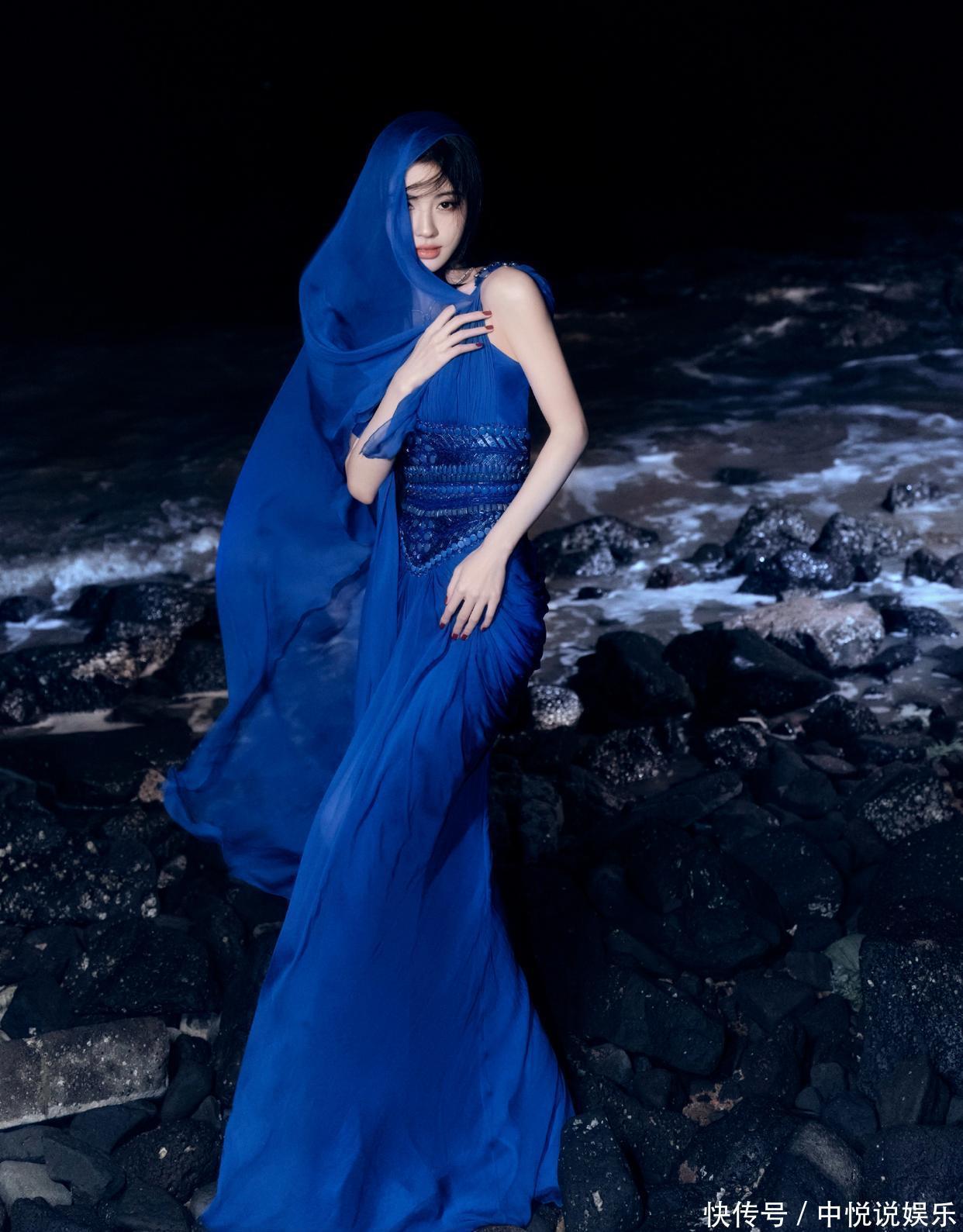当鞠婧祎站在夜色里的礁石滩时,整个画面像极了 “深海人鱼的出逃时刻”—— 她穿的蓝纱裙是冷色调的 “画布”,礁石的黑、海浪的白是 “底色”,而她是唯一的 “艳色”,连发丝被风吹乱的弧度都像是画里的笔触。