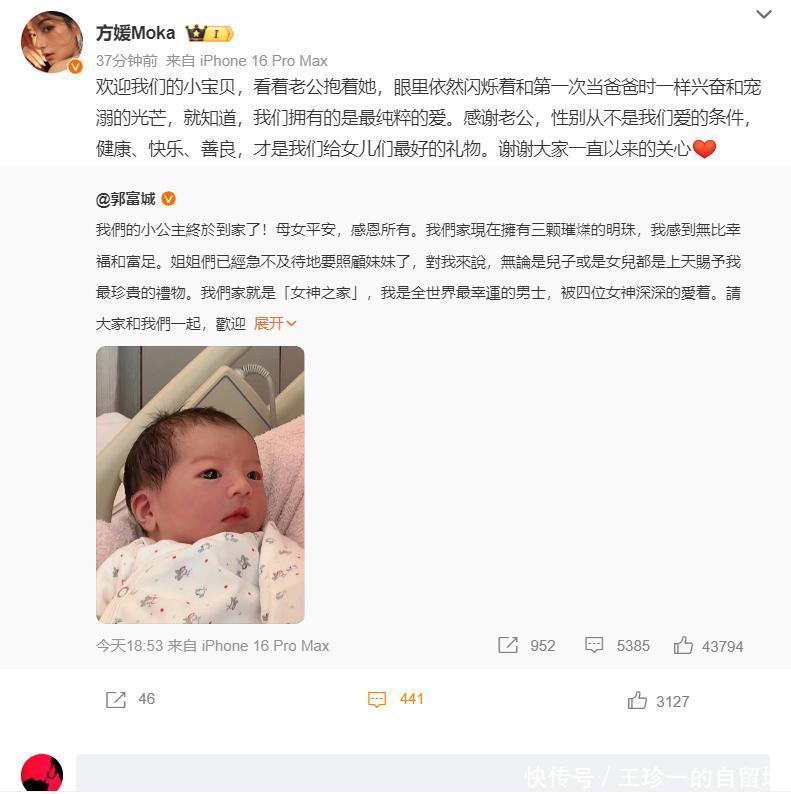 看到郭富城方媛官宣三胎得女的喜讯,大家也是纷纷留言恭喜。