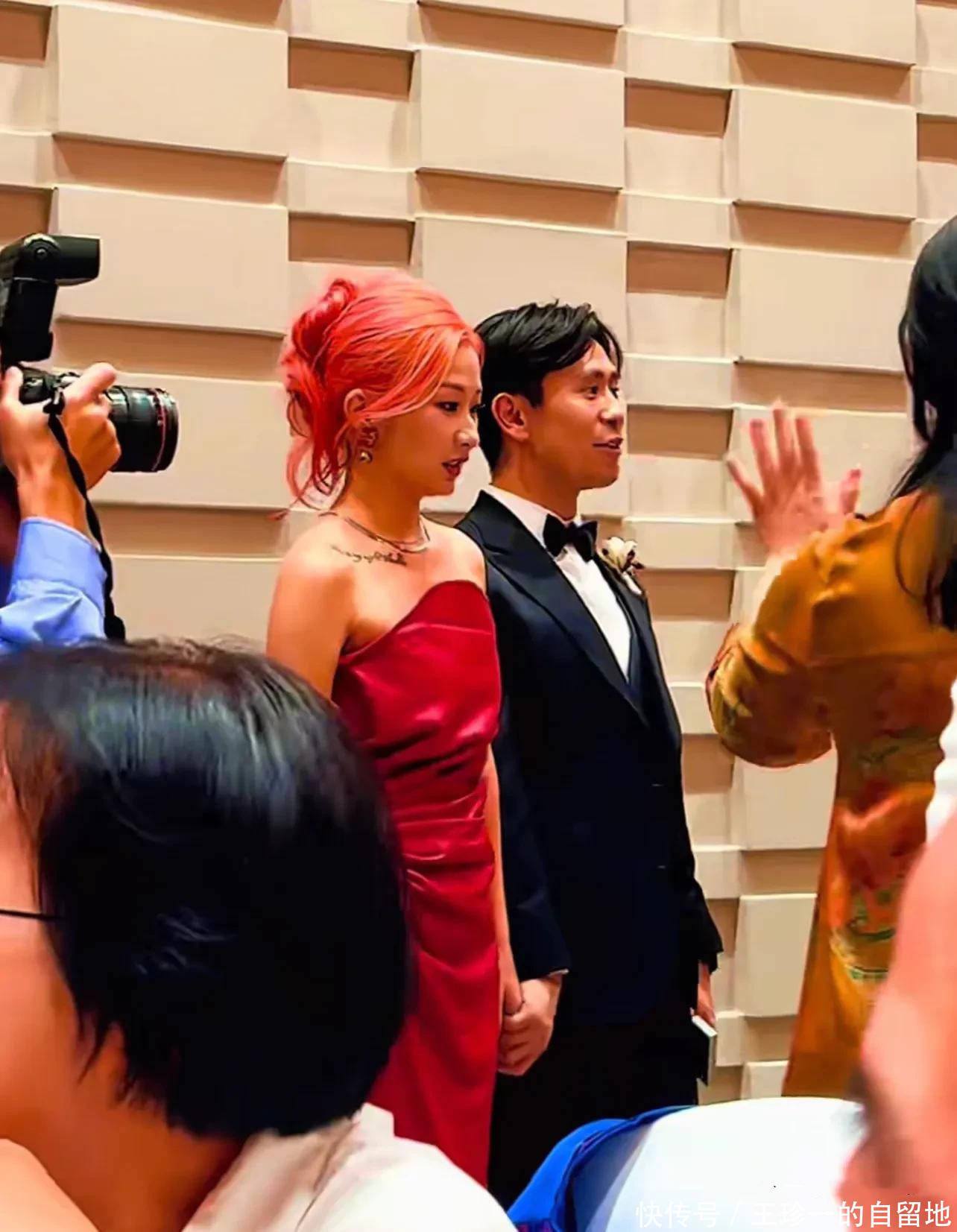 从视频中可以看到,在婚礼仪式开始之前,刘一丝穿了一件抹胸红色长裙,她染了一头红发。