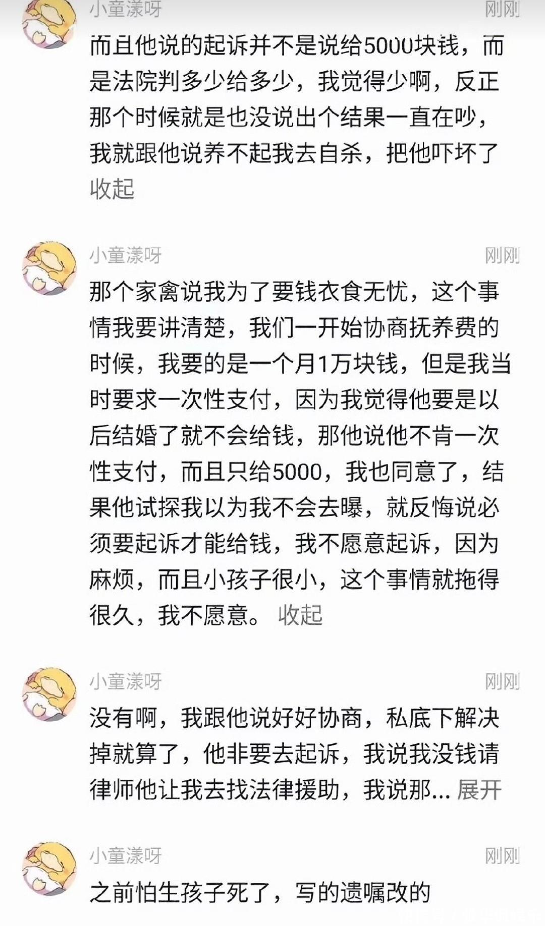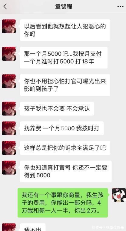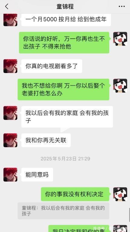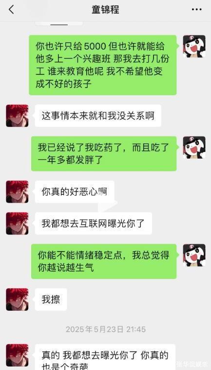 最后这个抚养费,童锦程提到5000块钱,每月支付。从这里就能看到,他其实已经聊烦了,不想继续掰扯了。