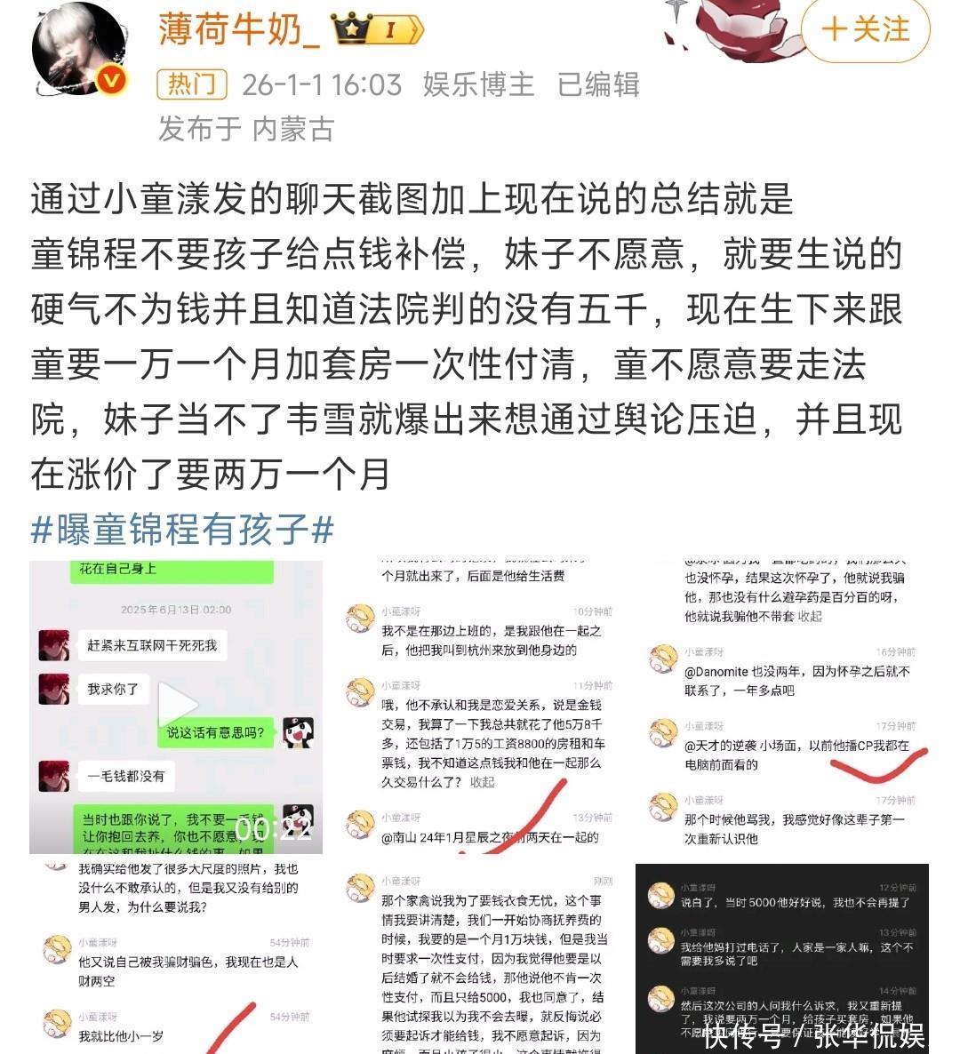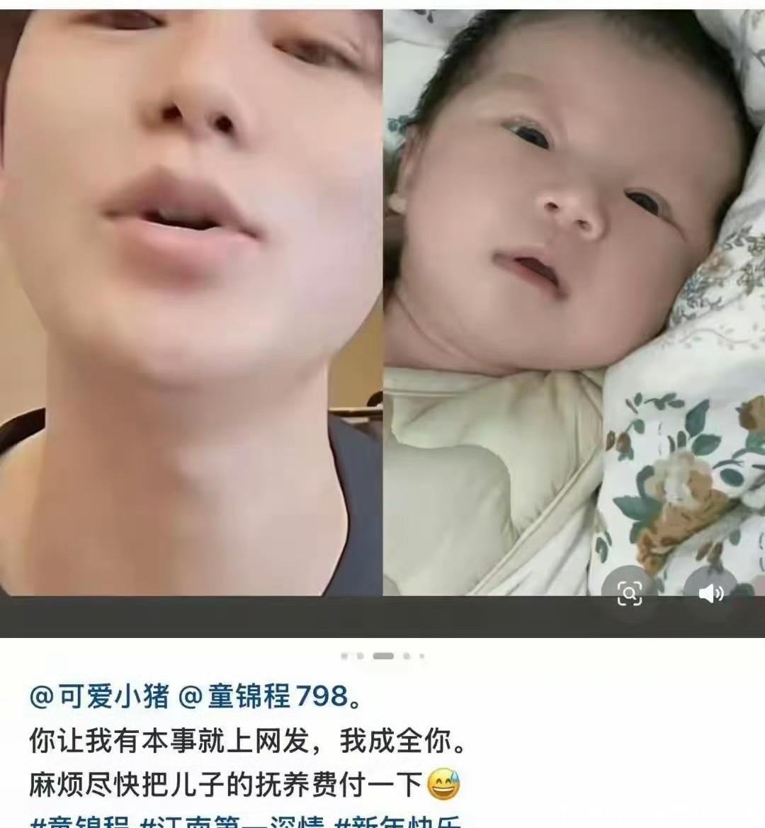 掰扯孩子然而2026年1月1日,他却忽然被爆出大瓜,让人目瞪口呆。当事人,也就是那个女孩,声称自己之前怀孕,确定孩子是童锦程的,并且联系了对方,希望能够生下来,并拿到抚养费。